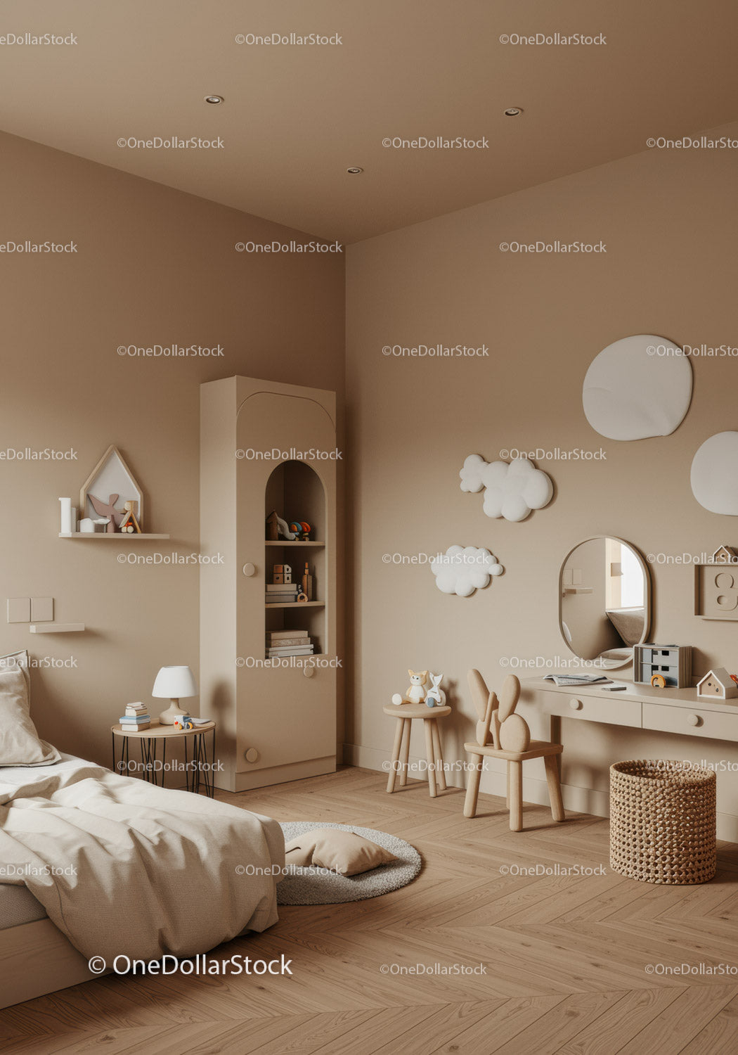 Piękny neutralny pokój dziecięcy z poduszkami w kształcie księżyców chmur i drewnianymi meblami
