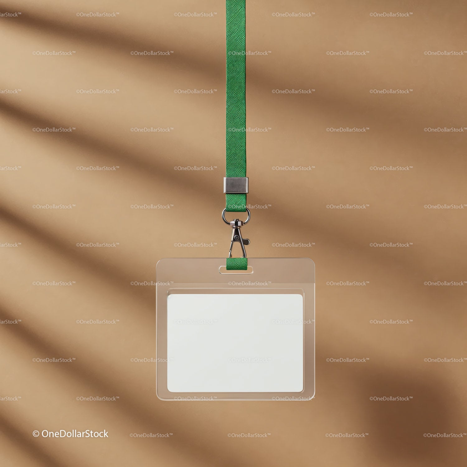 Pusty identyfikator z zieloną smyczą na beżowym tle