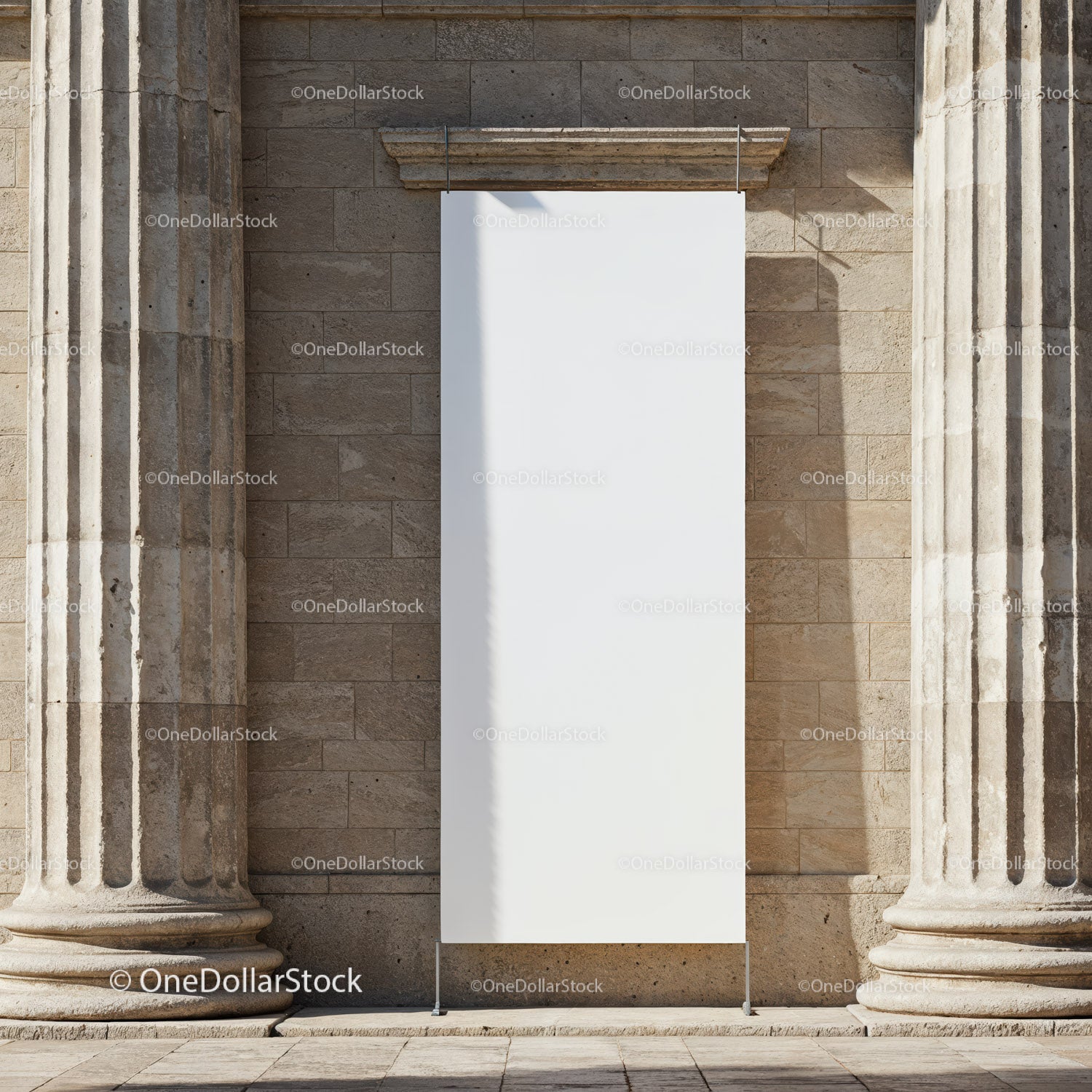 Pusty pionowy baner pomiędzy antycznymi kamiennymi kolumnami