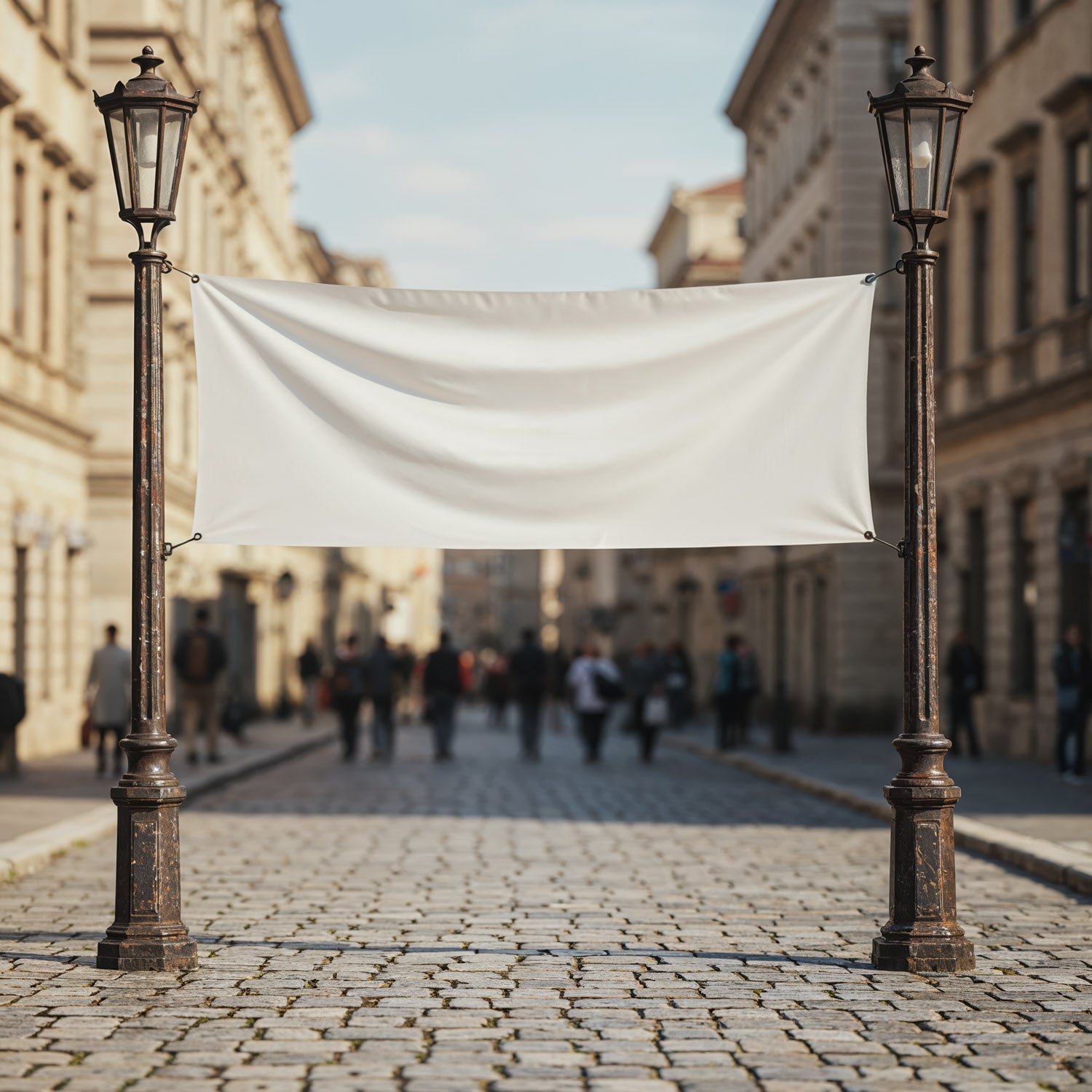 Pusty biały baner wiszący na zabytkowej ulicy miasta