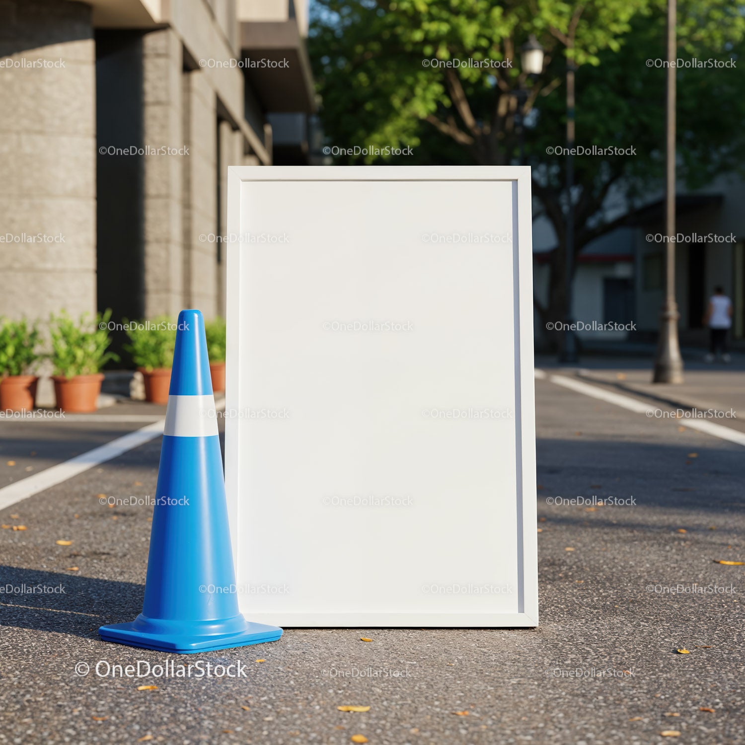 Pusta biała tablica z niebieskim pachołkiem drogowym na ulicy miejskiej