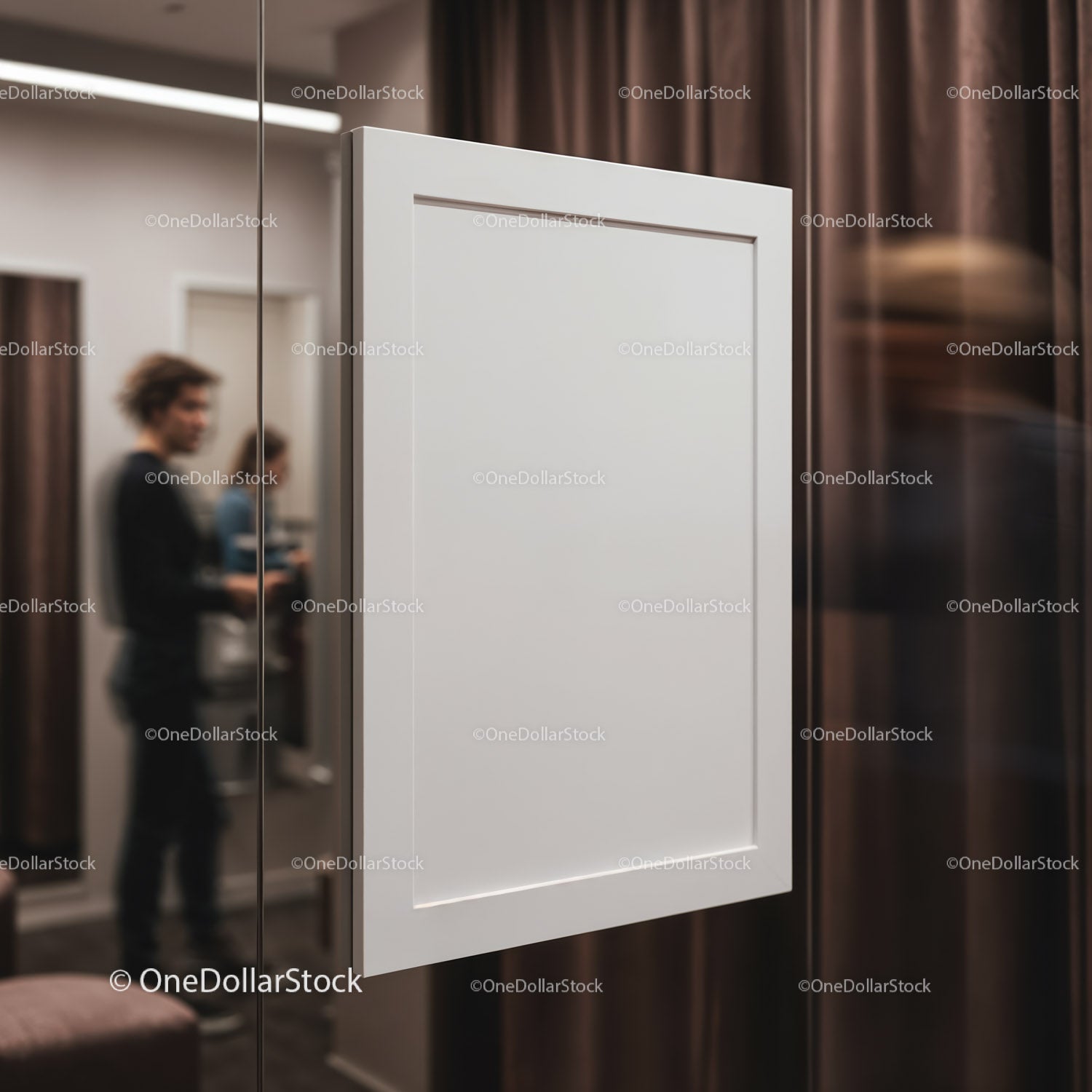 Pusta biała ramka w nowoczesnym wnętrzu z ludźmi