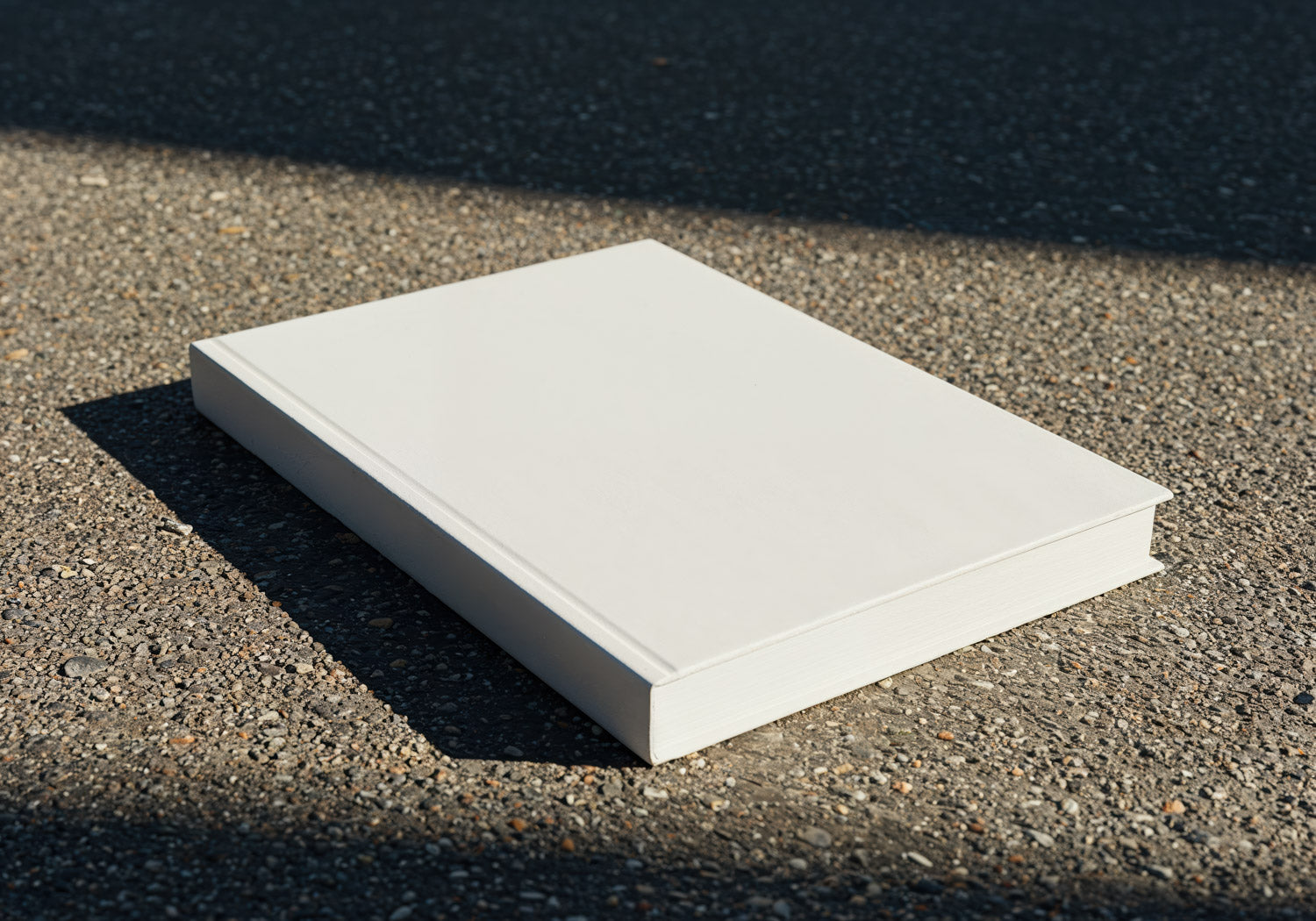Pusta, biała książka w twardej oprawie na teksturowanej powierzchni chodnika