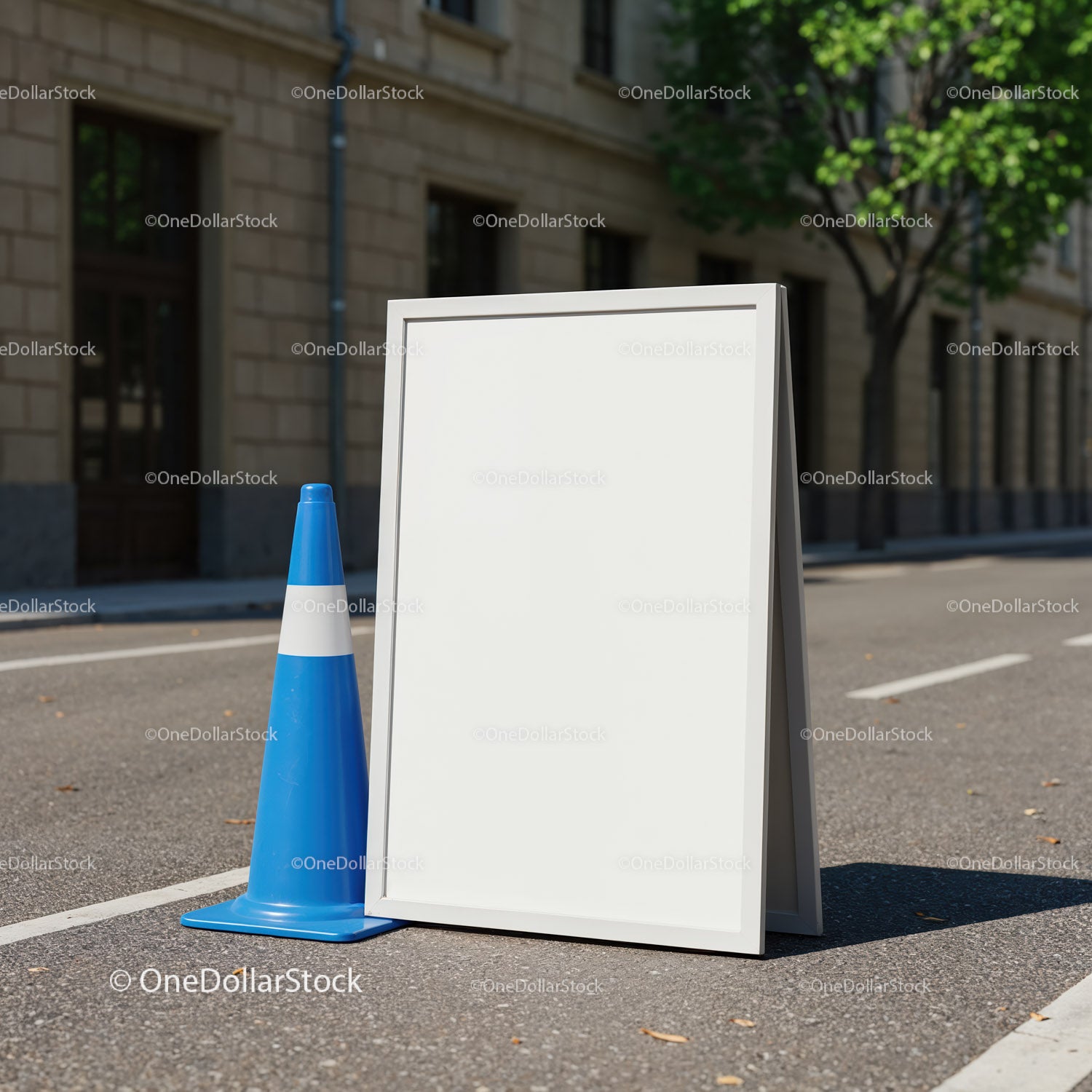 Pusta biała tablica z niebieskim pachołkiem drogowym na zewnątrz