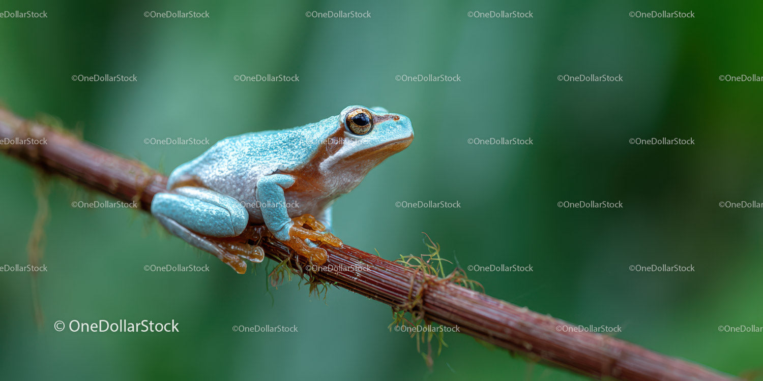 Błękitna żaba na gałęzi w tropikalnym lesie deszczowym
