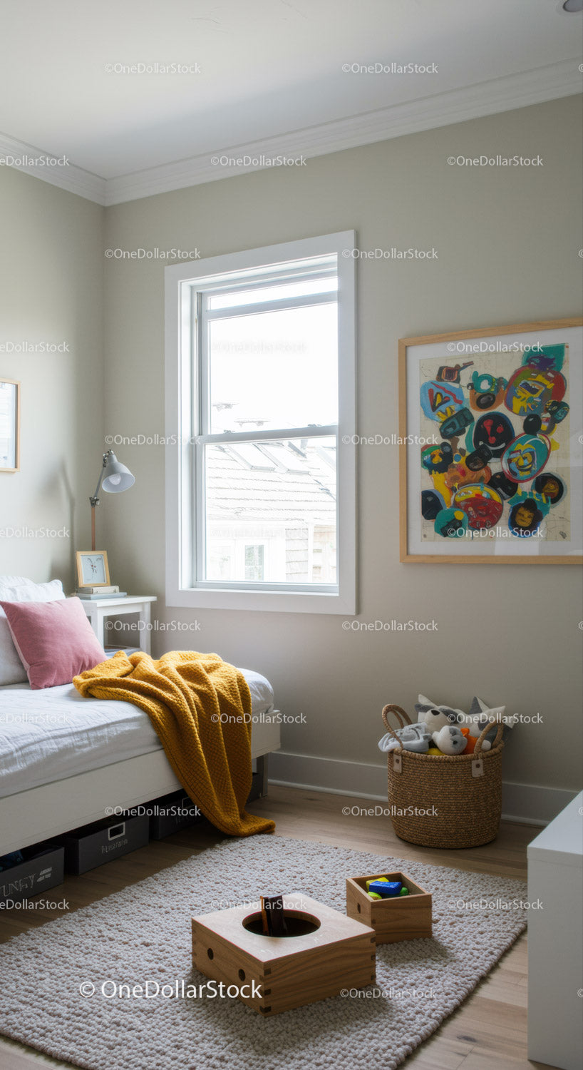 Jasny pokój dziecięcy z naturalnym światłem i wesołym wystrojem