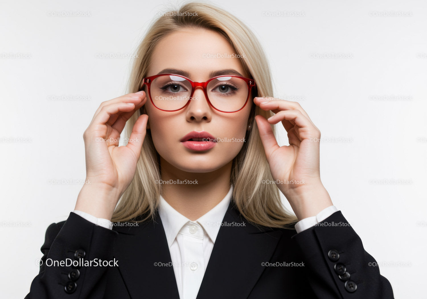 Biznesmenka w czerwonych okularach i blond włosach w studiu