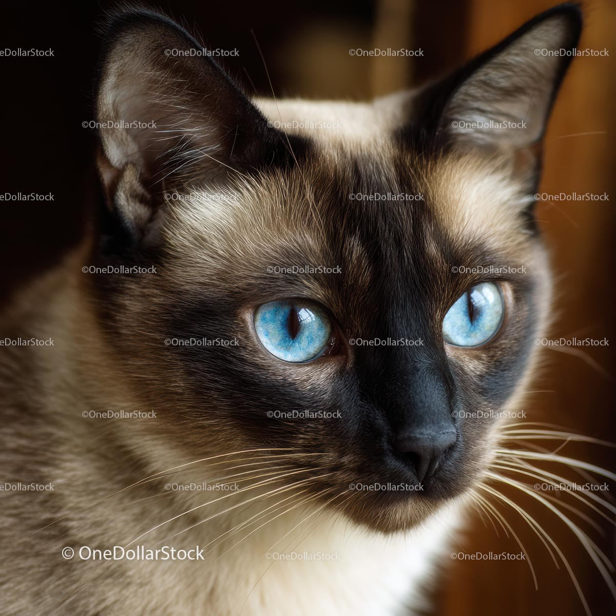 Spokojny kot syjamski z uderzającymi niebieskimi oczami z bliska