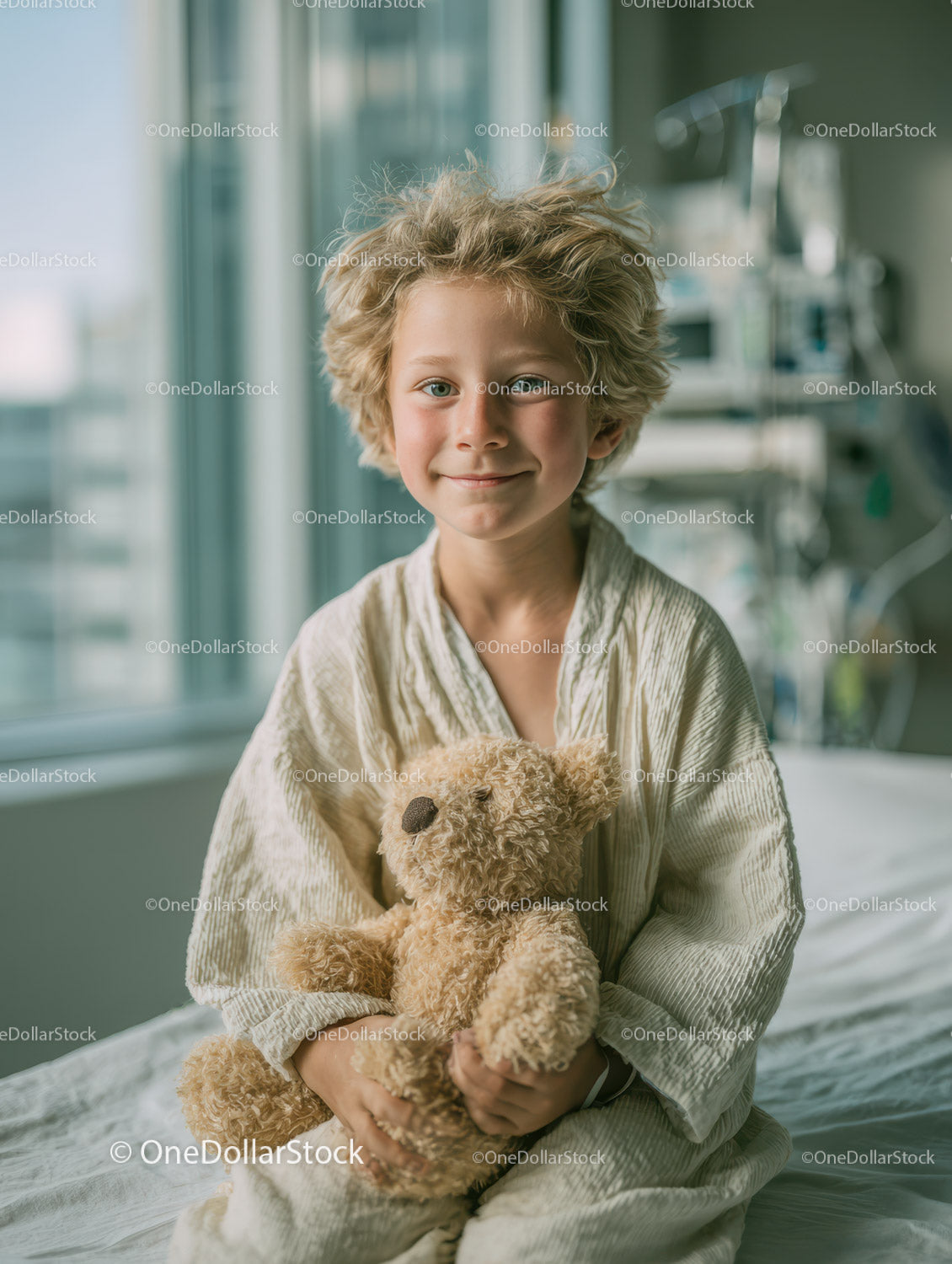 Wesoły chłopiec w szpitalnej sali trzymający pluszowego misia
