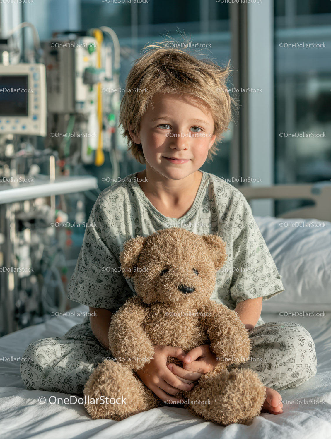 Dziecko w pokoju szpitalnym trzymające pluszowego misia na tle sprzętu medycznego