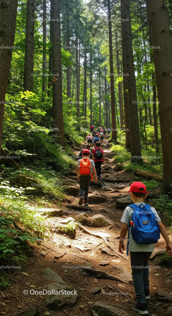 Dzieci wędrujące po nasłonecznionym leśnym szlaku