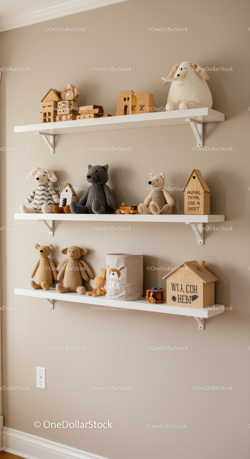 Pluszowe zabawki i drewniane dekoracje dla dzieci na półkach w pokoju dziecięcym