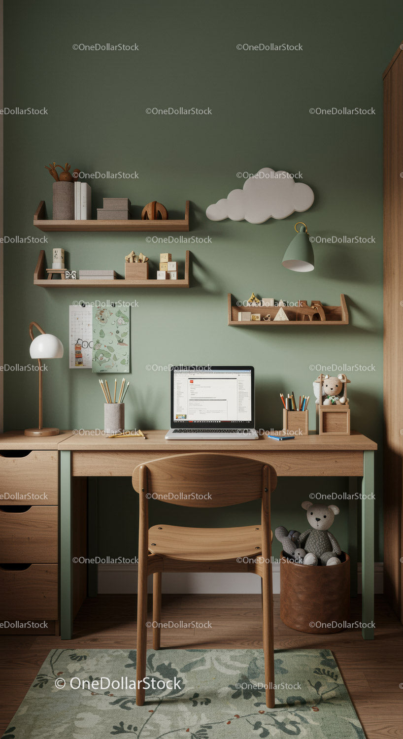 Przytulne, zielone biurko do nauki dla dzieci z drewnianymi półkami i pluszowymi zabawkami