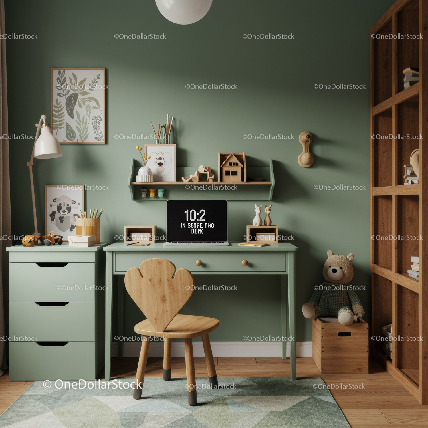 Pokój do nauki dla dzieci z drewnianym biurkiem i pluszowymi zabawkami w przytulnej zielonej przestrzeni