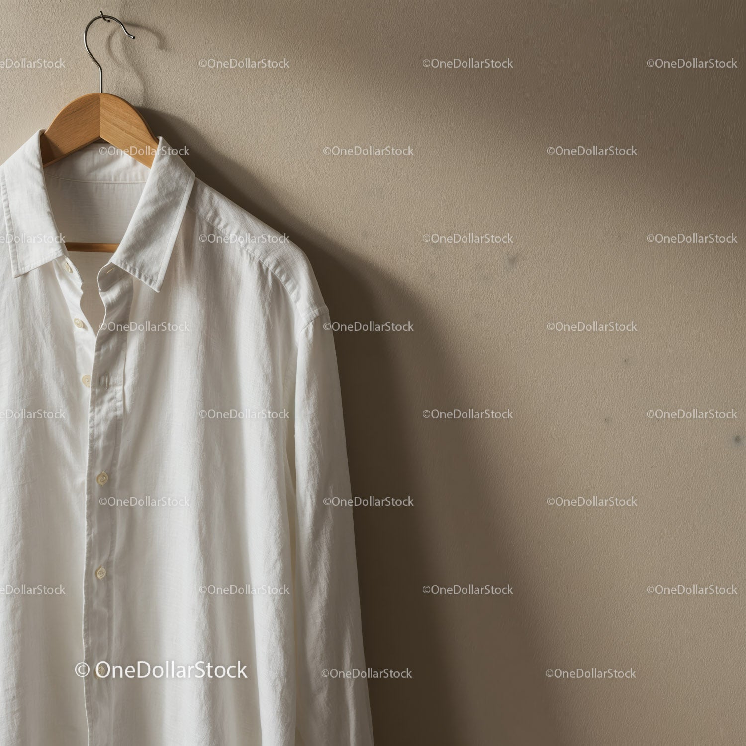 Klasyczna biała koszula wisząca na drewnianym wieszaku w pomieszczeniu