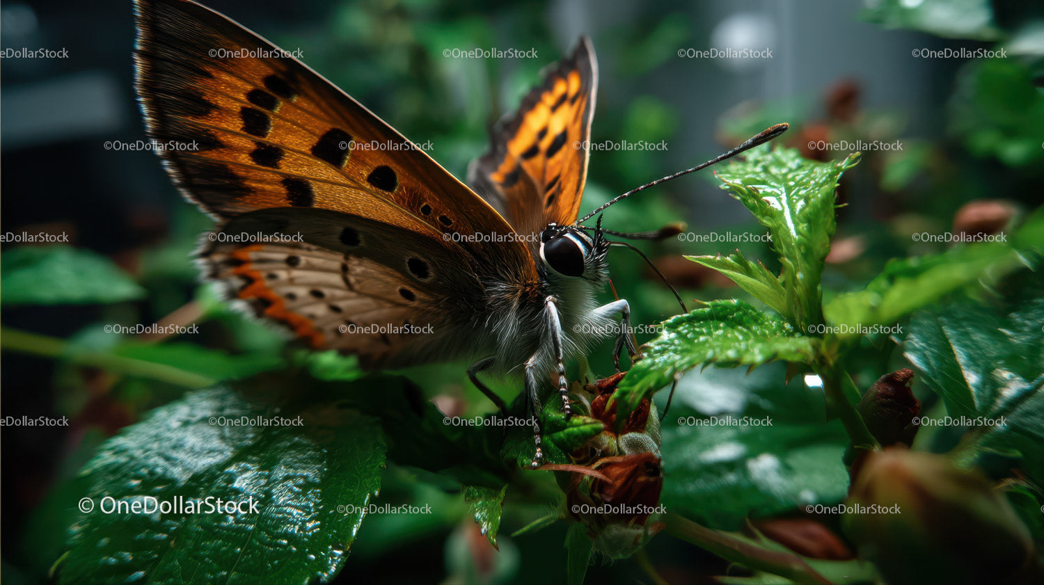 Zbliżenie na jaskrawopomarańczowego i czarnego motyla odpoczywającego na zielonych liściach