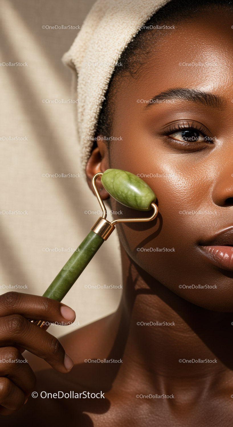 Zbliżenie na afrykańską kobietę używającą wałka kosmetycznego z jadeitu do odmładzania skóry