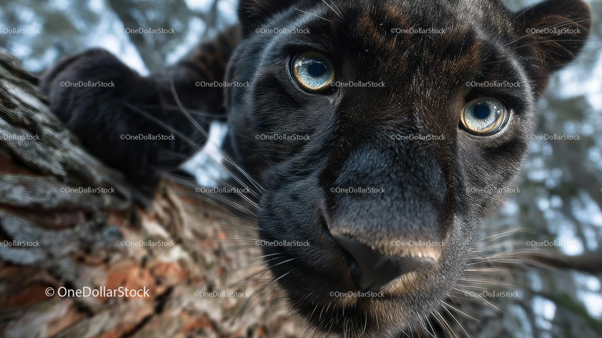 Zbliżenie na Czarną Panterę z intensywnym spojrzeniem w leśnym otoczeniu