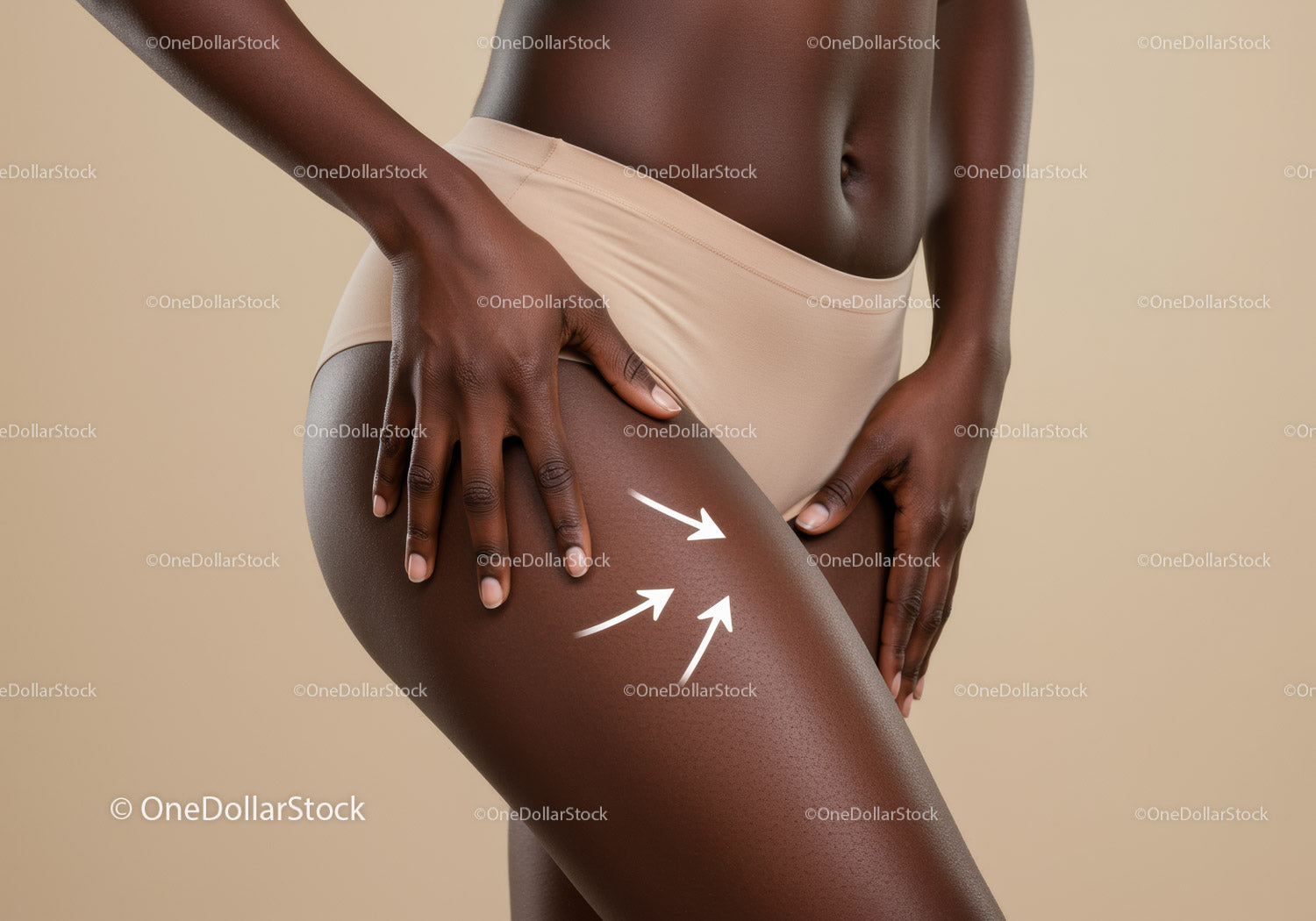 Zbliżenie dłoni kobiety o ciemnej skórze na udzie, z fakturą skóry i naturalnym blaskiem