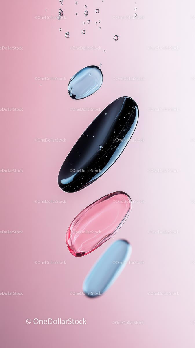 Zbliżenie na unoszące się pigułki z kroplami wody na delikatnym różowym tle