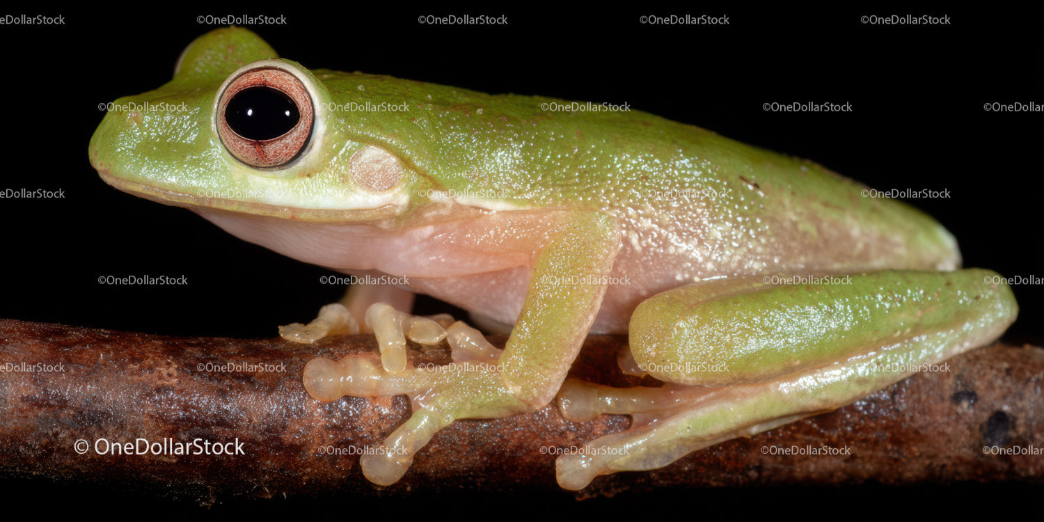 Zbliżenie na zieloną żabę drzewną na gałęzi z dużymi oczami
