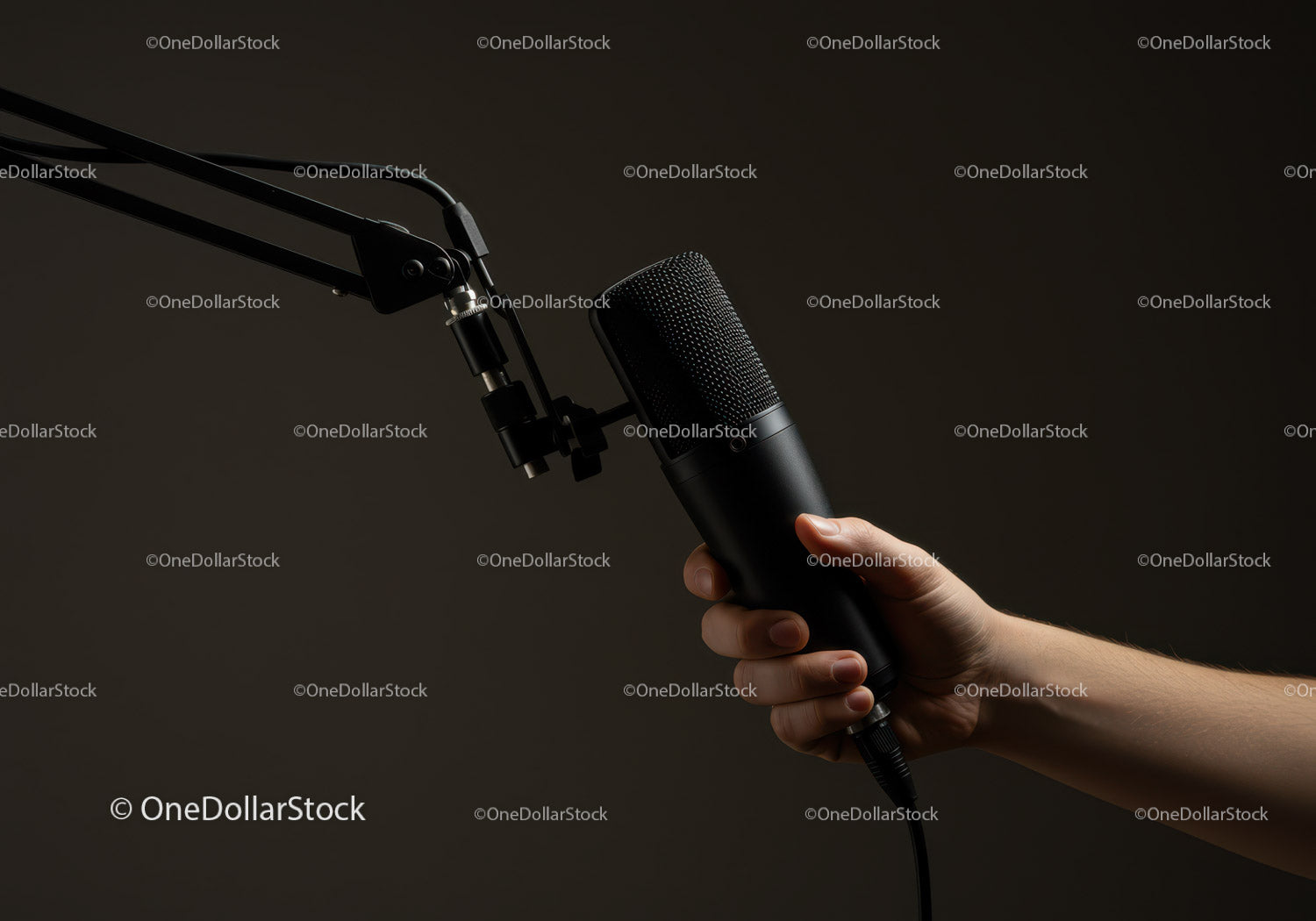 Zbliżenie dłoni trzymającej profesjonalny mikrofon pojemnościowy w studiu