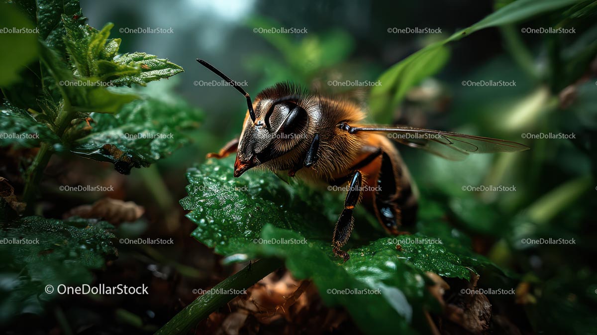 Zbliżenie pszczoły miodnej na bujnym zielonym liściu w ogrodzie