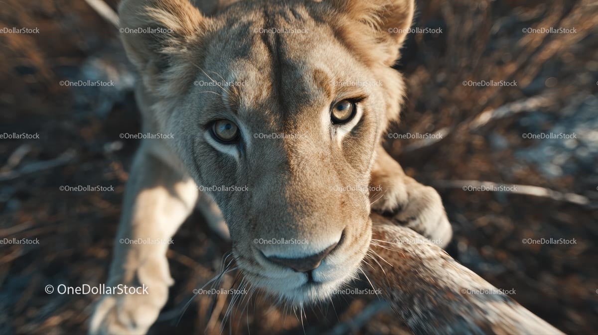 Zbliżenie lwa z intensywnym spojrzeniem w naturalnym środowisku
