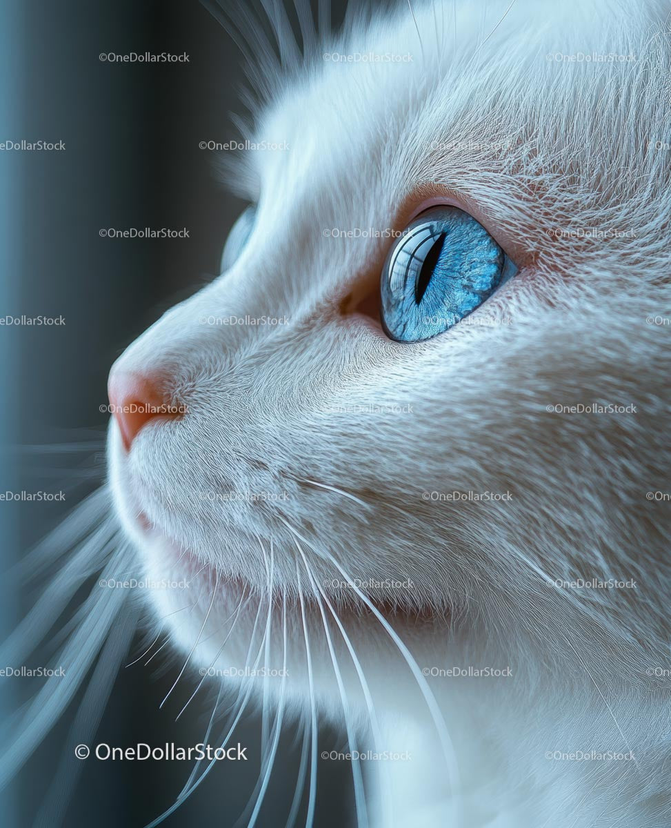 Urzekające zbliżenie białego kota ukazuje jego wyraziste niebieskie oczy i puszyste futro. Spokojne spojrzenie kota i delikatne wąsy są podkreślone, oddając urok tego domowego zwierzęcia. Kompozycja oferuje szczegółowy widok profilu kota, co czyni ją idealną dla miłośników zwierząt i miłośników fotografii.