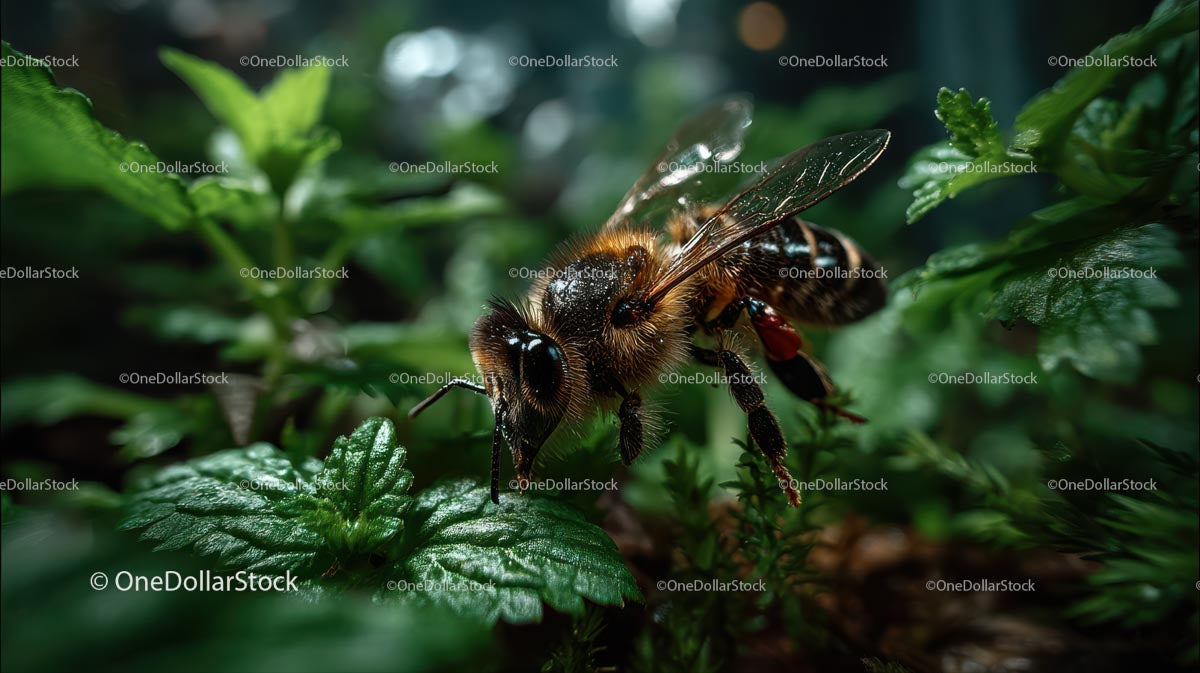 Zbliżenie pszczoły miodnej na zielonym liściu w ogrodzie