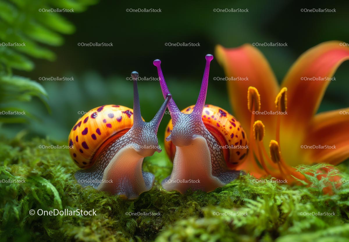 Kolorowe ślimaki i pomarańczowa lilia na soczyście zielonym mchu