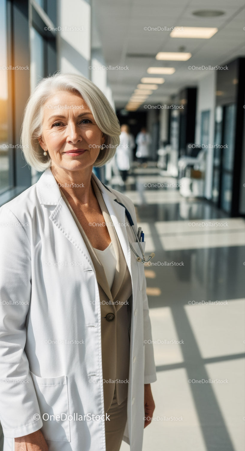 Pewna siebie starsza lekarka stojąca na korytarzu szpitalnym