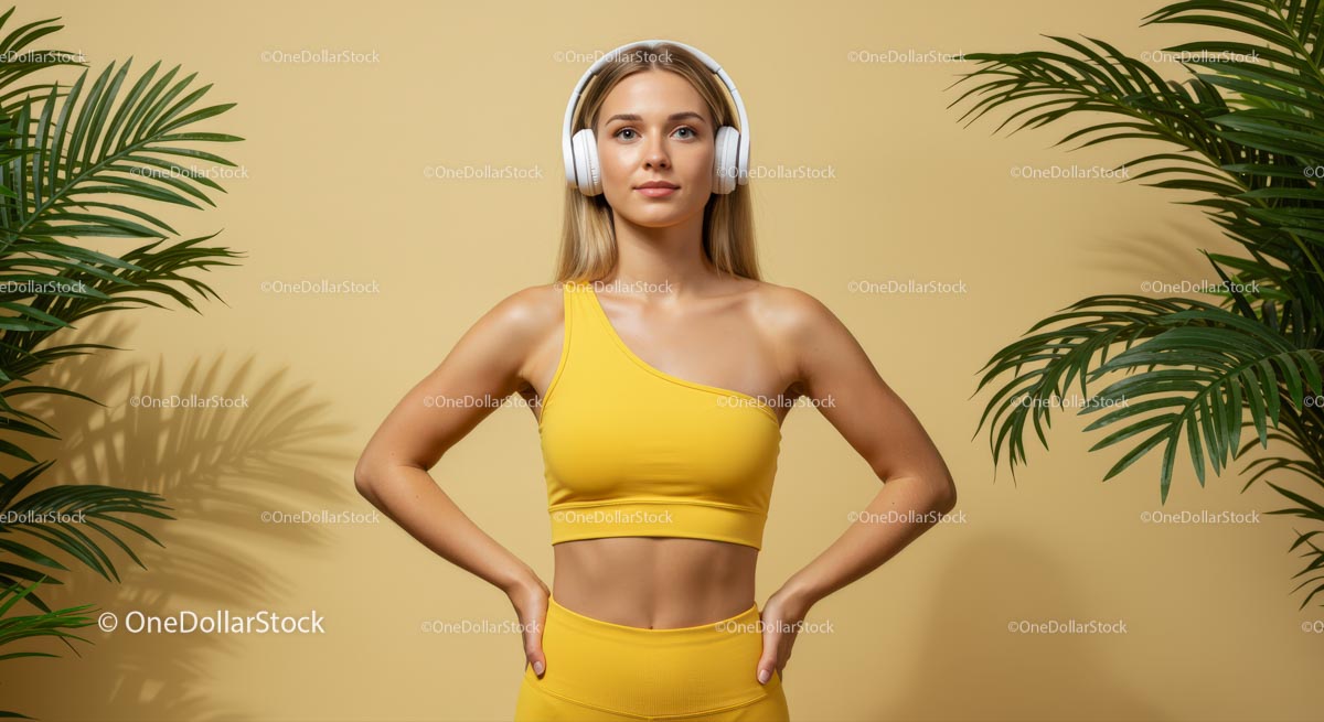 Pewna siebie kobieta w żółtym stroju fitness ze słuchawkami