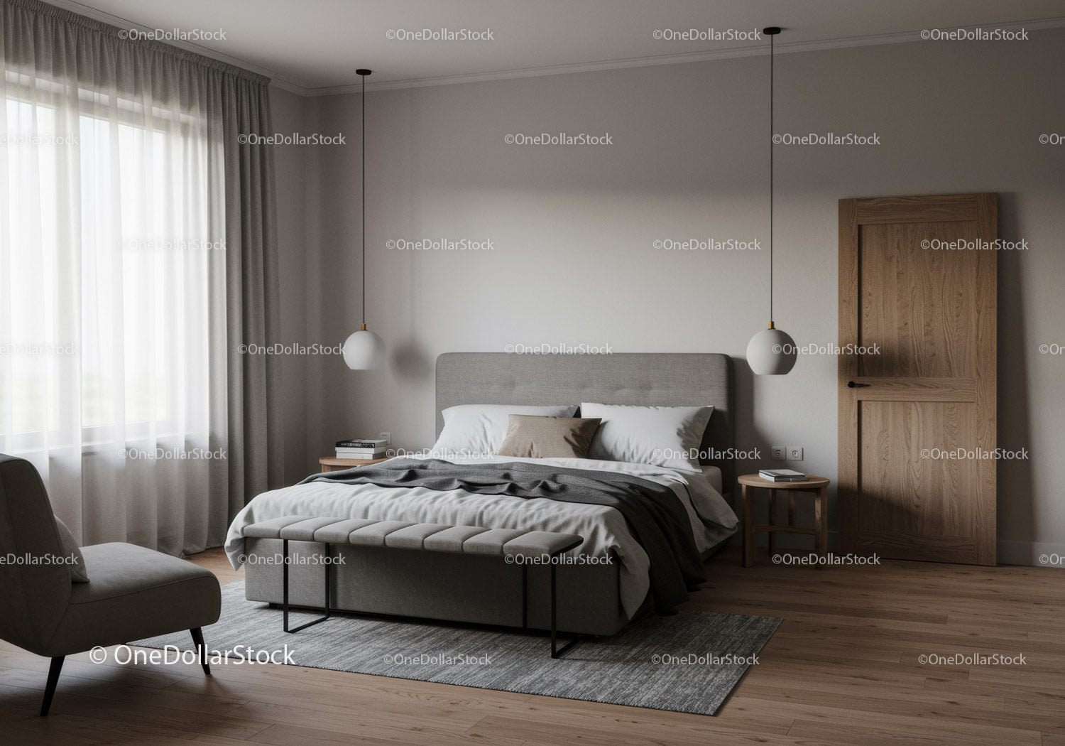 Nowoczesne wnętrze sypialni z neutralnymi tonami i drewnianymi akcentami