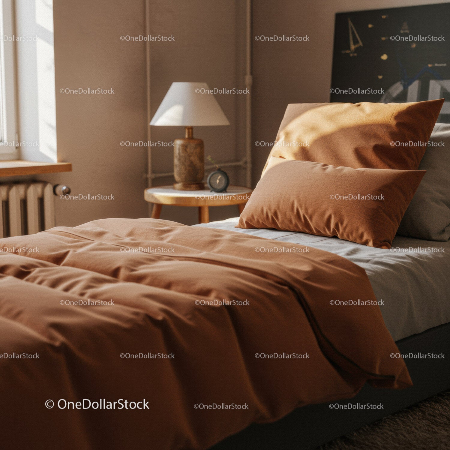 Przytulna sypialnia z pomarańczową pościelą i delikatnym naturalnym światłem