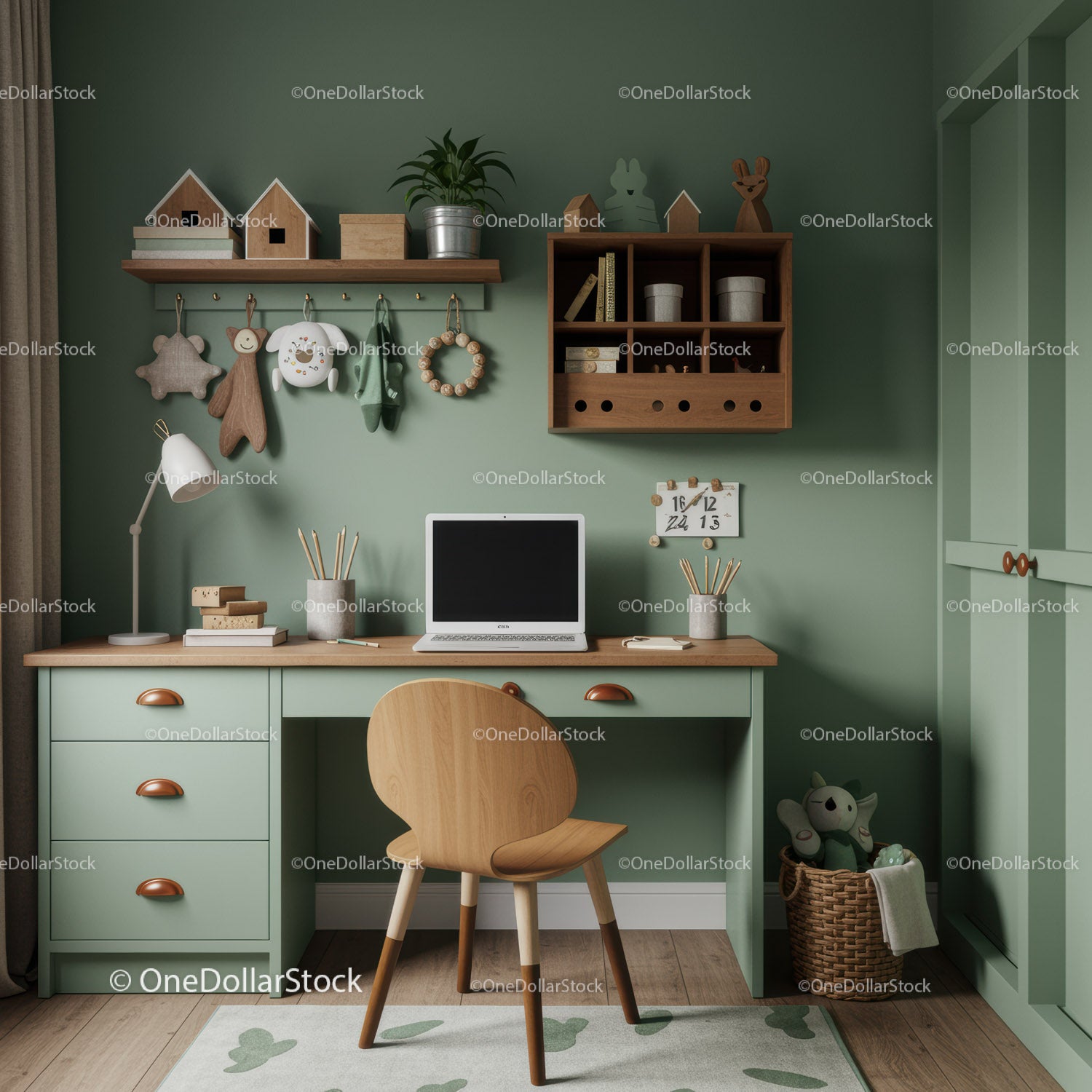Przytulny pokój dziecięcy z drewnianym biurkiem i wesołymi dekoracjami w kolorze zielonym