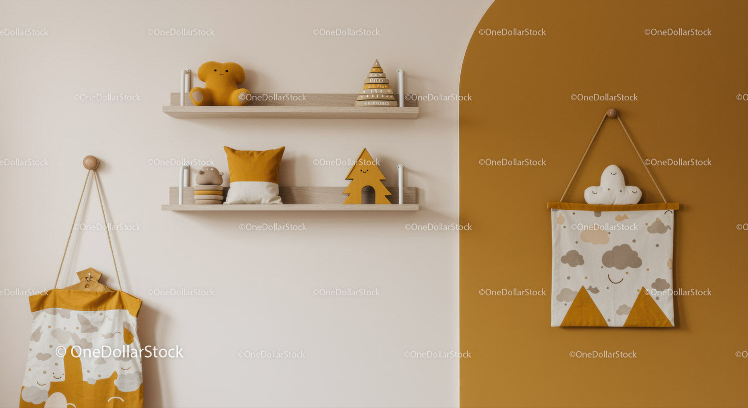 Przytulny pokój dziecięcy z poduszką w kształcie chmury i drewnianymi półkami
