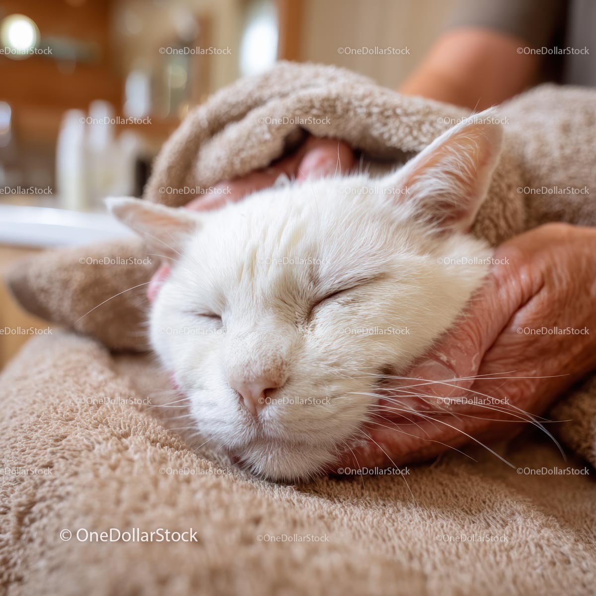 Przytulny biały kot relaksujący się w miękkim kocyku