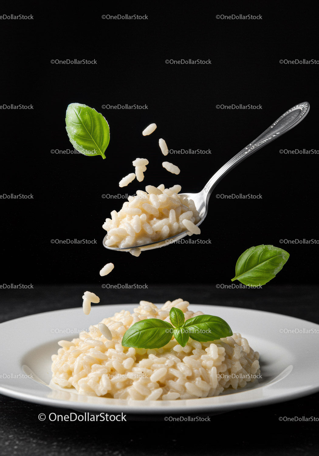 Talerz kremowego risotto udekorowanego świeżymi zielonymi listkami bazylii tworzy zachęcający i elegancki posiłek. Idealnie ugotowany ryż wydaje się miękki i soczysty, niemal rozpływając się w bogatej konsystencji. Srebrna łyżka nabiera porcję risotto, a kilka ziarenek delikatnie opada na talerz, oddając jego ruch i świeżość. Żywe listki bazylii dodają naturalnego koloru i nuty aromatu, podnosząc atrakcyjność dania. Czarne tło pięknie kontrastuje z jasnymi odcieniami ryżu, podkreślając prostotę i smak tego klasycznego włoskiego dania w wyrafinowanej formie.
