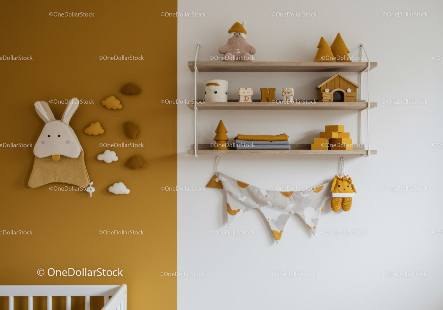 Uroczy pokój dziecięcy z dekoracjami ściennymi w kształcie pluszowej chmurki i drewnianymi półkami
