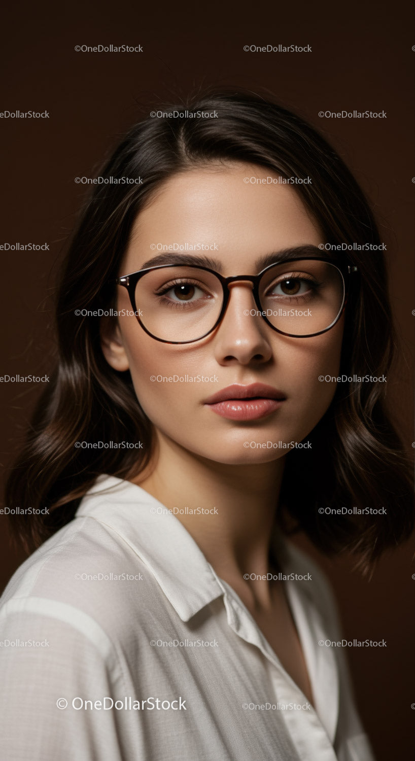 Elegancka kobieta w przezroczystych okularach i z brązowymi włosami