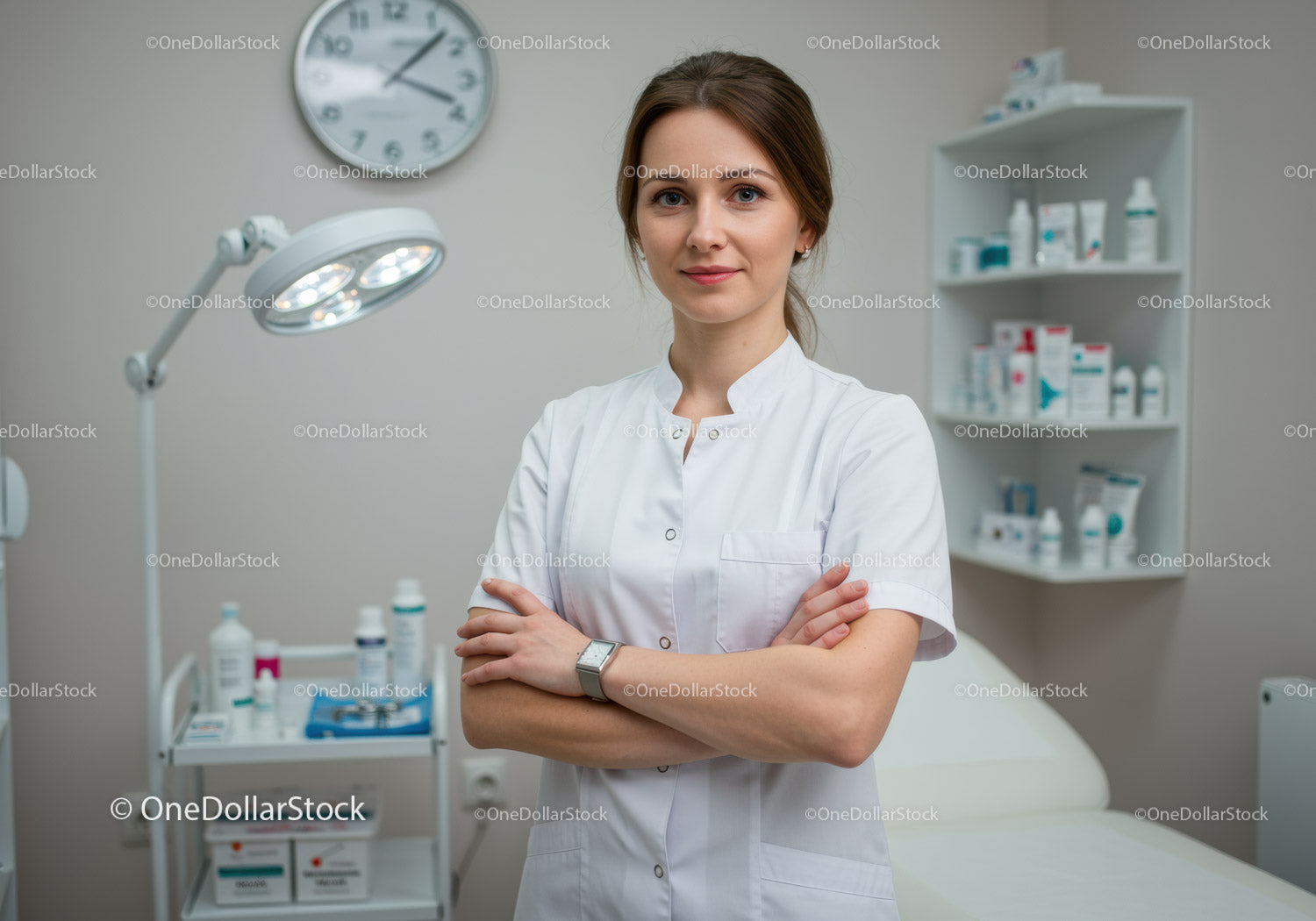 Pielęgniarka stojąca ze skrzyżowanymi ramionami w nowoczesnej klinice opieki zdrowotnej