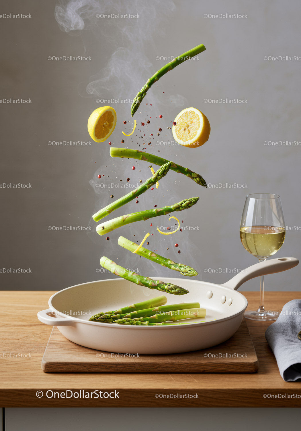 Świeże szparagi i plasterki cytryny skwierczące na patelni