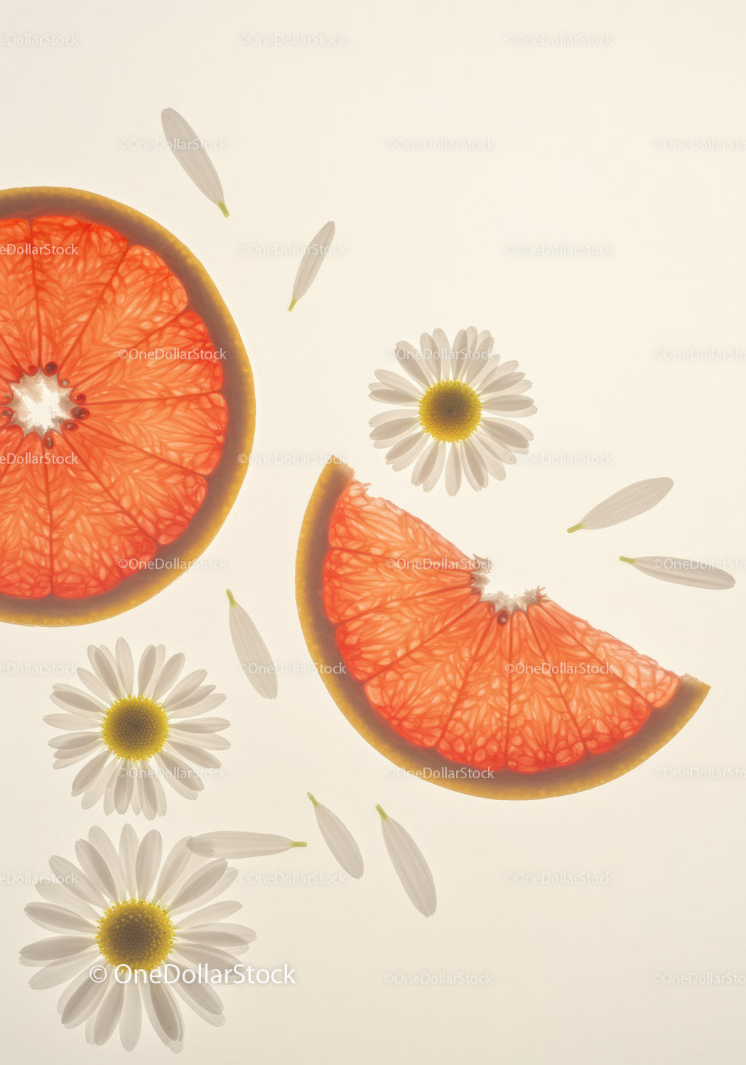 Świeże plasterki grejpfruta z kwiatami rumianku na białym tle