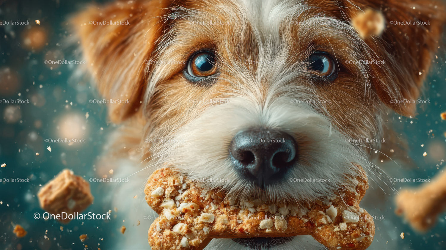 Pies z jasnoniebieskimi oczami gryzie kość ciasteczkową. Zbliżenie.