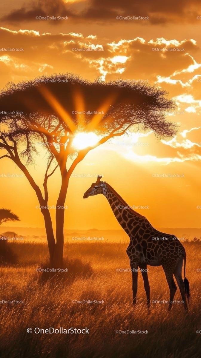 Sylwetka żyrafy o zachodzie słońca na afrykańskiej sawannie