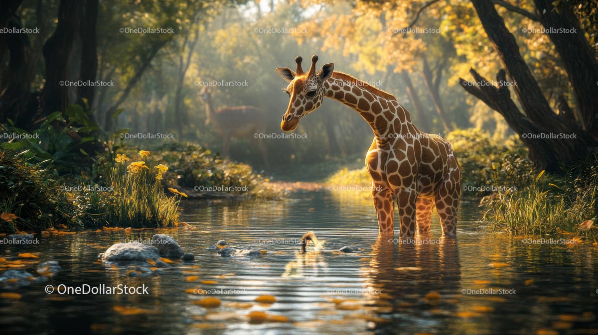Żyrafa brodząca w nasłonecznionej leśnej rzece