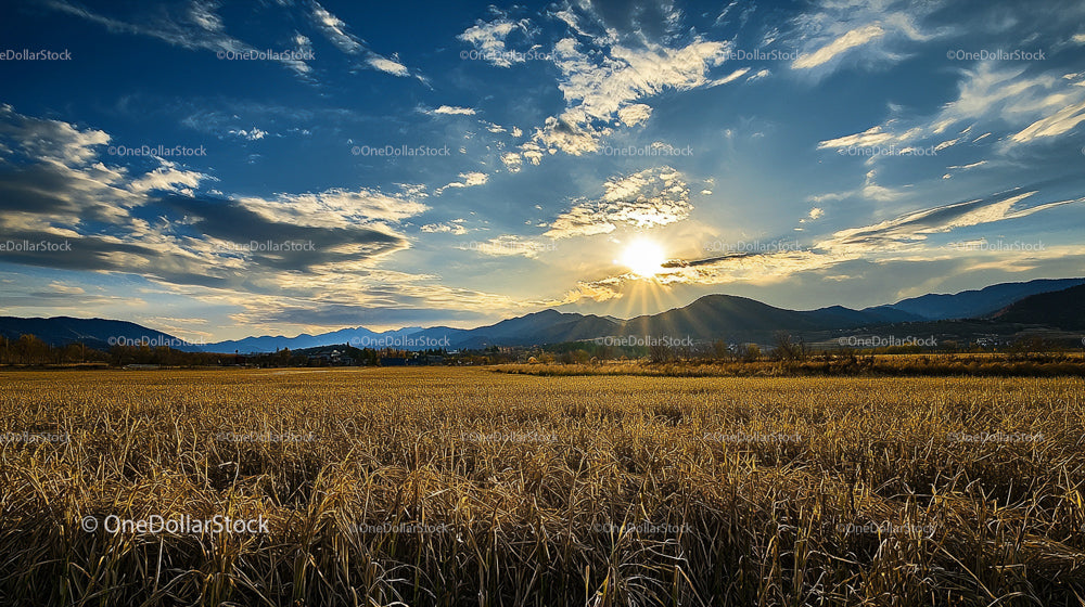Złoty zachód słońca nad górskim krajobrazem i polem