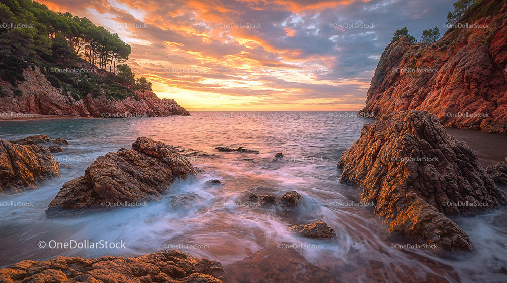 Złoty zachód słońca nad skalistym wybrzeżem Morza Śródziemnego
