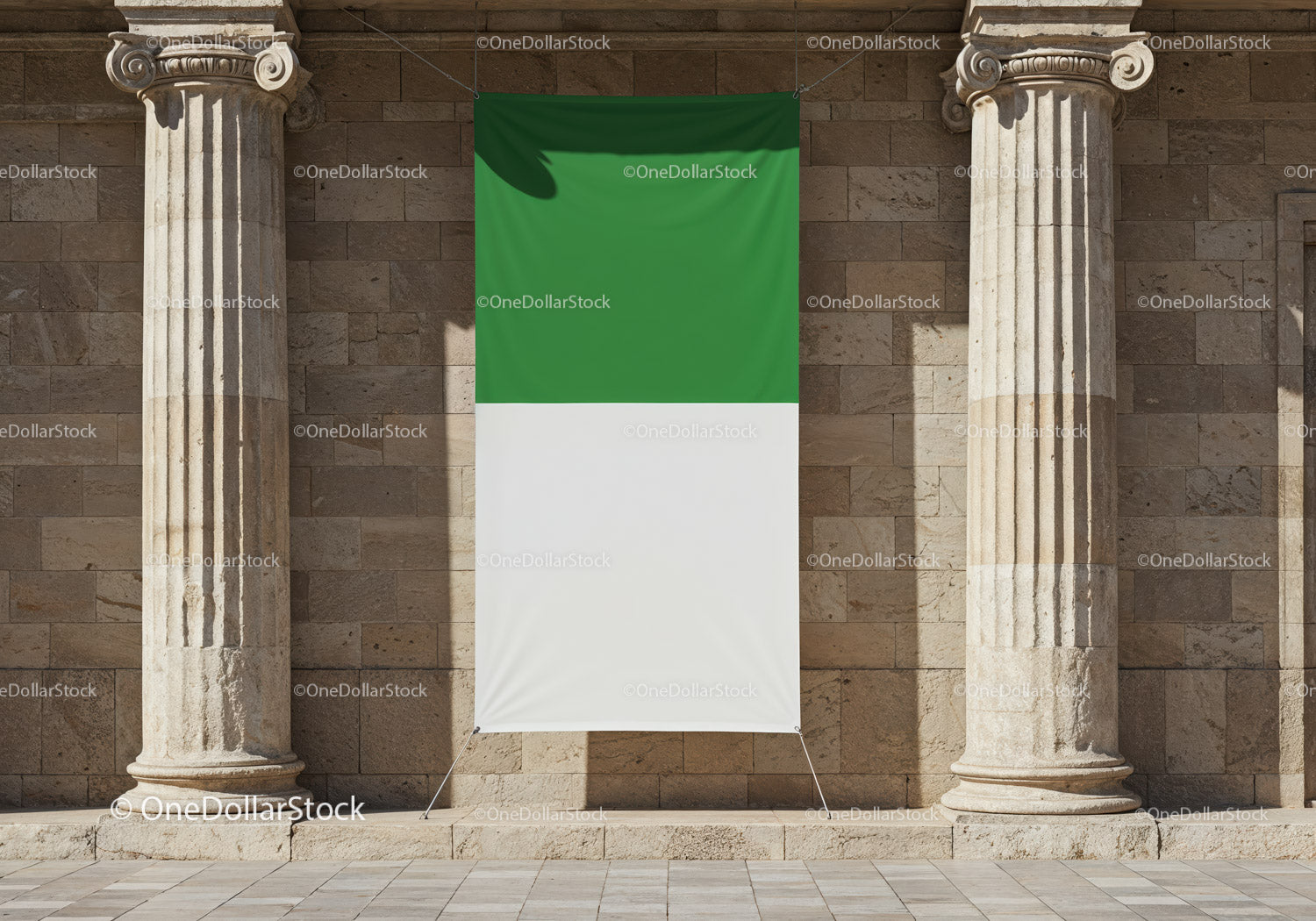 Zielono-biały sztandar wiszący między kamiennymi kolumnami
